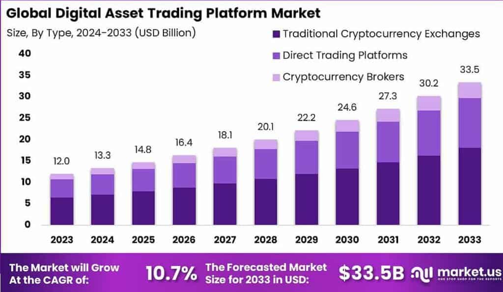 Global Digital Asset Trading Platform Market Size, Share, Trends Analysis By Type (Traditional Cryptocurrency Exchanges, Direct Trading Platforms, Cryptocurrency Brokers), By Application (Public traded funds, Private buy-and-hold funds, Hedge Funds), By End-User (Individuals, Institutions/Businesses), Region and Companies – Industry Segment Outlook, Market Assessment, Competition Scenario, Trends and Forecast 2024-2033