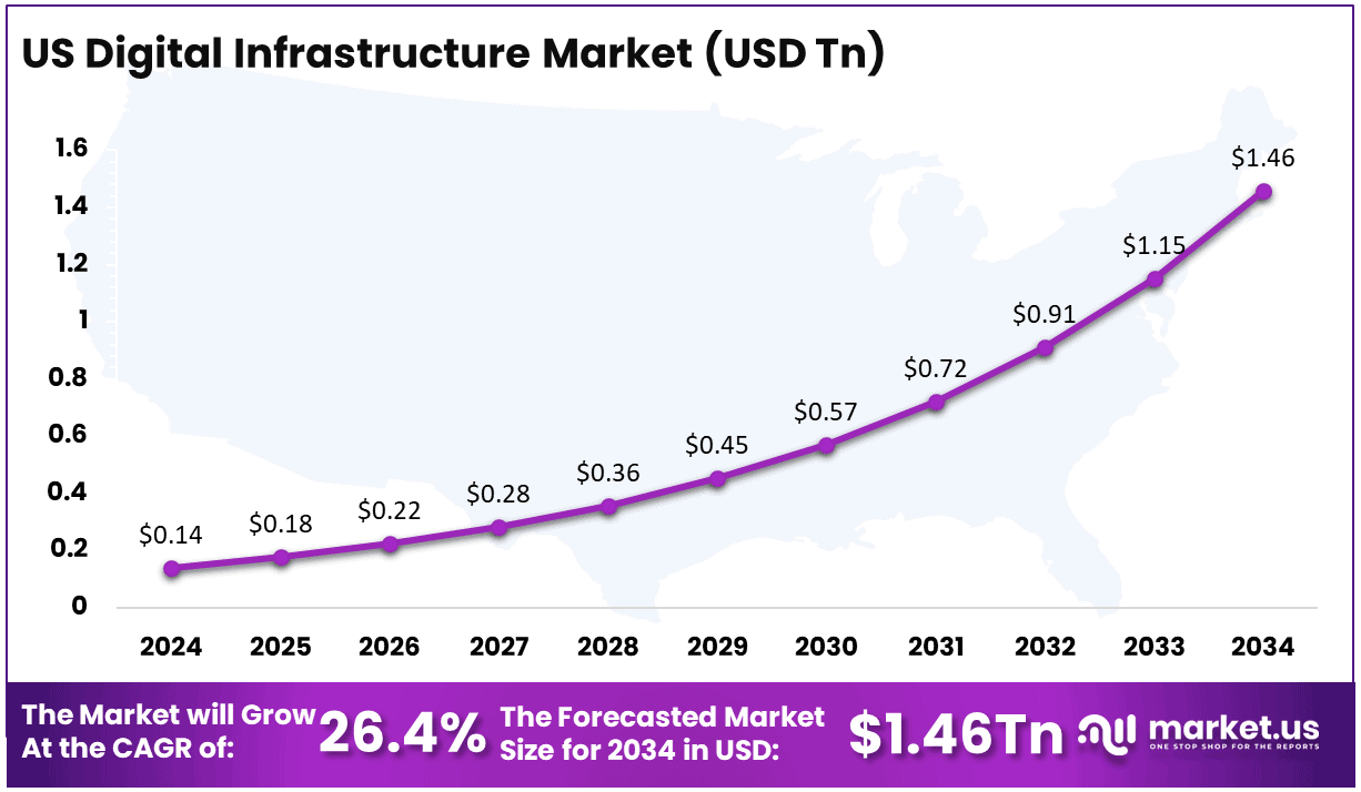- Market Growth: The Digital Infrastructure Market is expected to grow from USD 0.41 trillion in 2024 to USD 4.55 trillion by 2034, expanding at a CAGR of 27.20% over the forecast period.