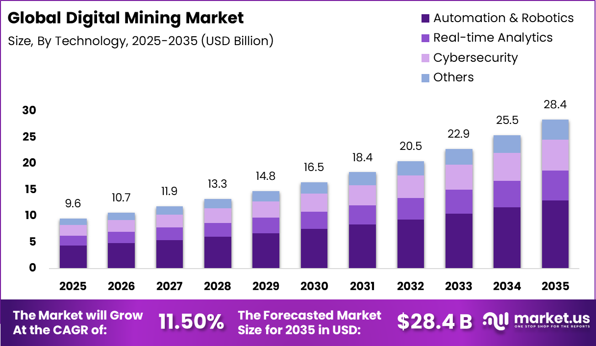 The digital mining market focuses on the use of advanced digital technologies to improve exploration, extraction, and operational management in the mining industry. These technologies include data analytics, connected sensors, automation systems, and digital platforms that monitor equipment and production activities.