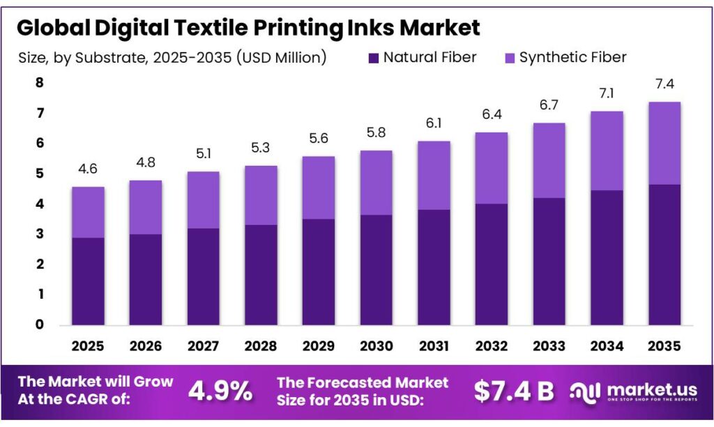 - Digital Textile Printing Inks Market size is expected to be worth around USD 7.4 Billion by 2035, from USD 4.6 Billion in 2025, growing at a CAGR of 4.9%.