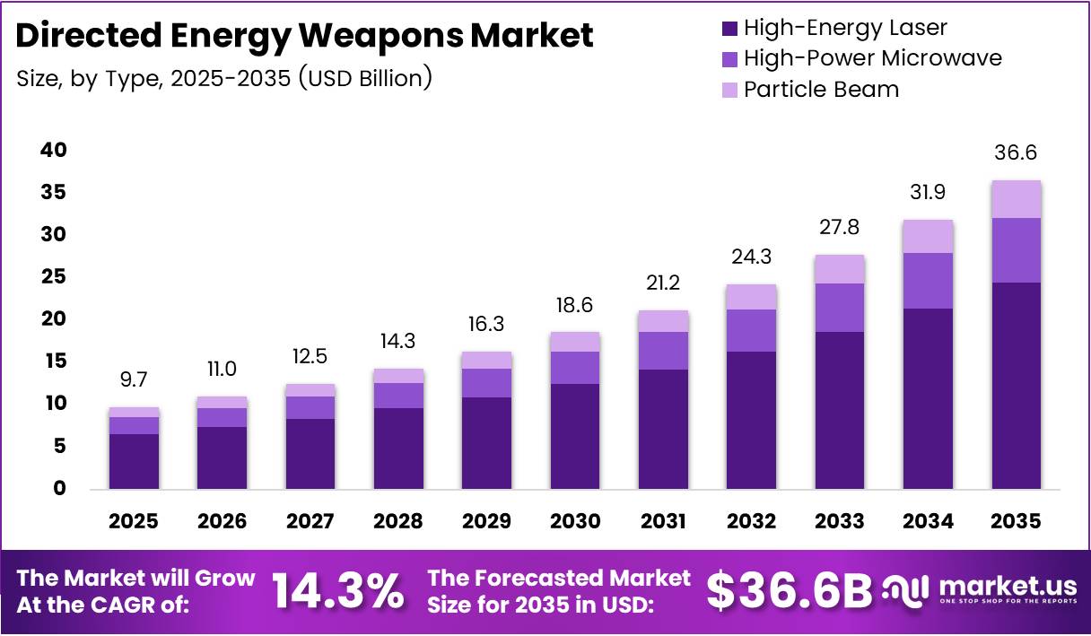 Global Directed Energy Weapons Market size is expected to be worth around USD 36.6 Billion by 2035 from USD 9.7 Billion in 2025, growing at a CAGR of 14.3% during the forecast period 2026 to 2035.