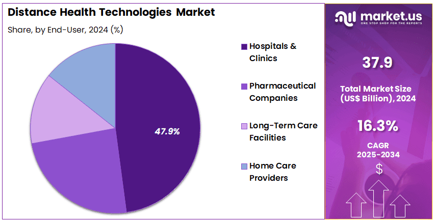 Hospitals and clinics hold the dominant share of 47.9% in the end-user segment of the distance health technologies market. This dominance is expected to grow as healthcare facilities increasingly integrate telemedicine and virtual care models to improve operational efficiency and patient care. Hospitals and clinics benefit from distance health technologies by enhancing their ability to deliver quality care while reducing overhead costs associated with in-person visits.