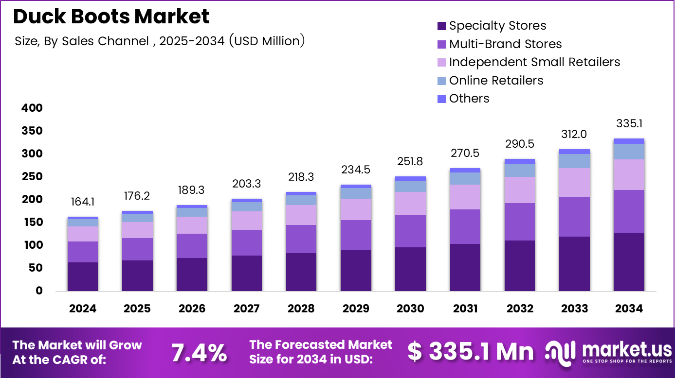 - The global Duck Boots Market is projected to reach USD 335.1 million by 2034, expanding from USD 164.1 million in 2024 at a 7.4% CAGR.