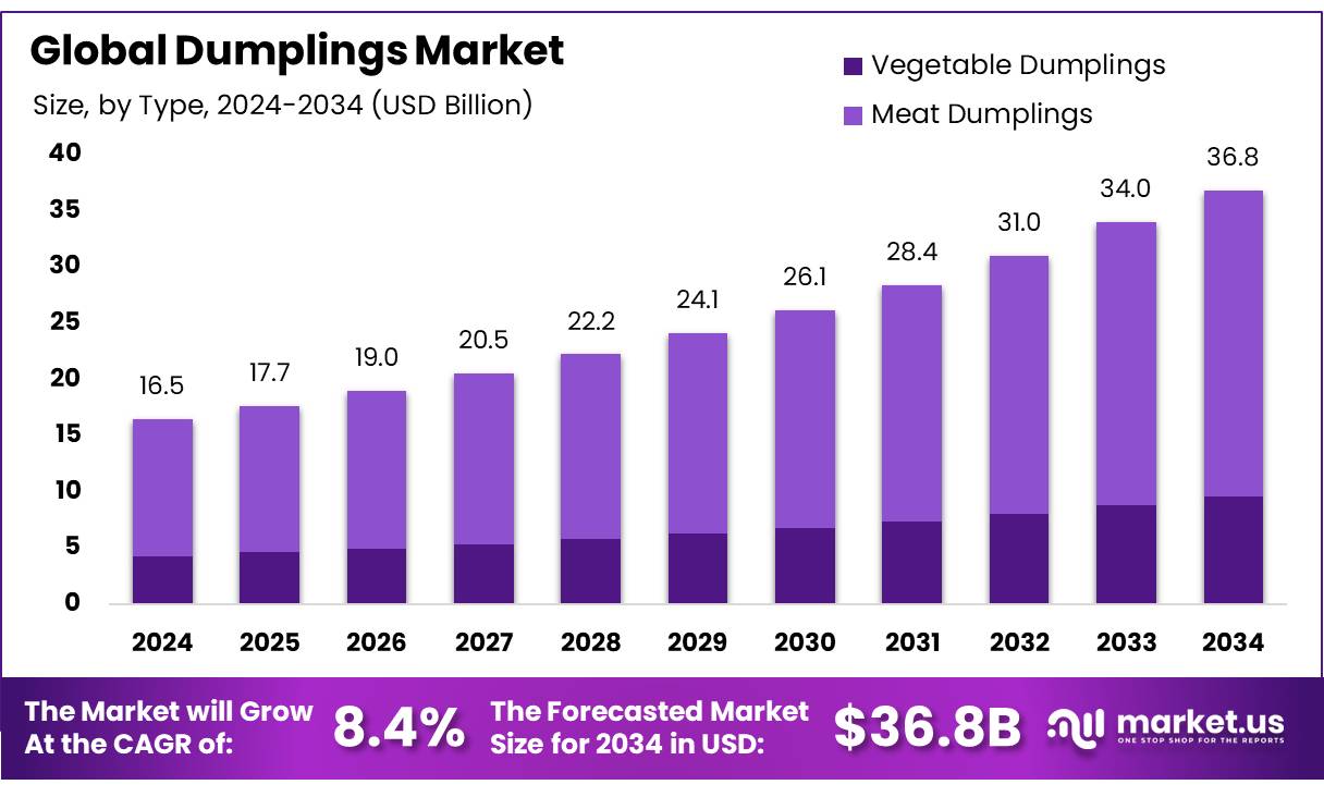 The Global Dumplings Market size is expected to be worth around USD 36.8 billion by 2034, from USD 16.47 billion in 2024, growing at a CAGR of 8.4% during the forecast period from 2025 to 2034.