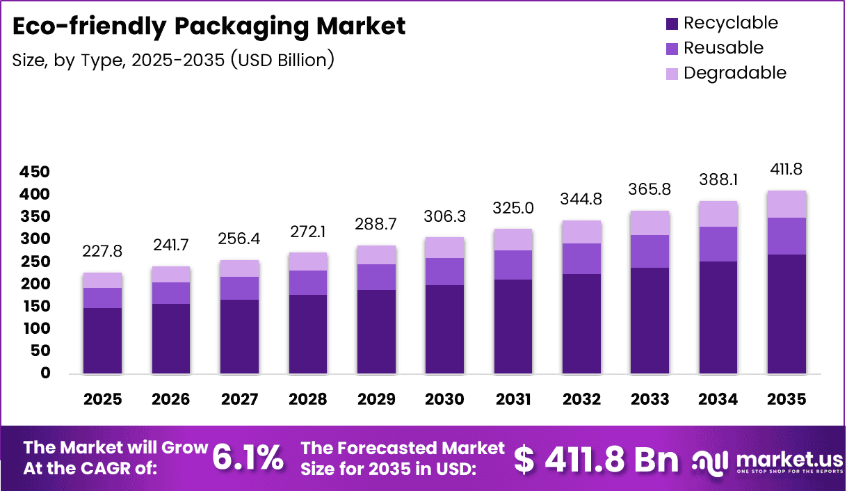 Global Eco-Friendly Packaging Market size is expected to be worth around USD 411.8 Billion by 2035 from USD 227.8 Billion in 2025, growing at a CAGR of 6.1% during the forecast period 2026 to 2035.