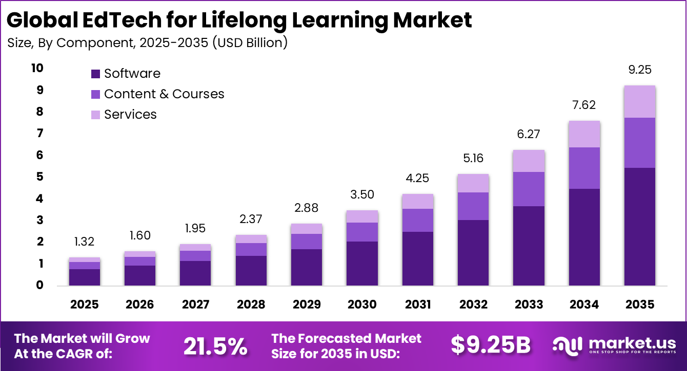 Global EdTech for Lifelong Learning Market Size, Share and Analysis By Component (Software, Content & Courses, Services), By Learner Type (Working Professionals, Career Changers, Retirees & Hobby Learners, Corporate Teams, Others), By Learning Mode (Self-paced Online Courses, Cohort-based Programs, Microlearning & Bite-sized Content, Blended Learning, Others), By Skills Focus (Professional & Technical Skills, Soft Skills & Leadership, Personal Development & Hobbies, Health & Wellness, Others), By Business Model (Subscription, Transactional, B2B Enterprise Licenses), By Regional Analysis, Global Trends and Opportunity, Future Outlook By 2025-2035