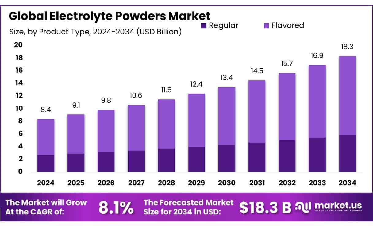 - Electrolyte Powders Market size is expected to be worth around USD 18.3 Bn by 2034, from USD 8.4 Bn in 2024, growing at a CAGR of 8.1%