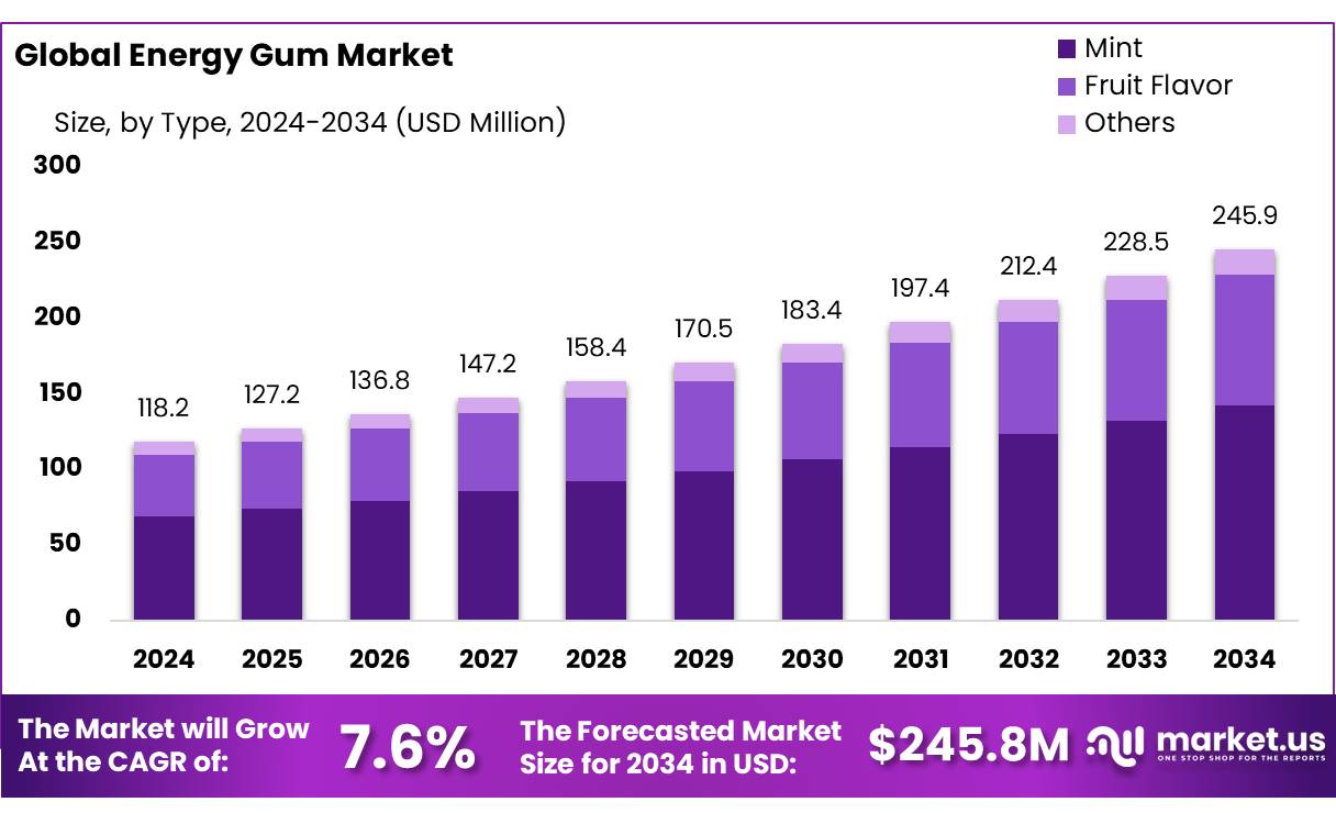 - Energy Gum Market size is expected to be worth around USD 245.9 Mn by 2034, from USD 118.2 Mn in 2024, growing at a CAGR of 7.6%.