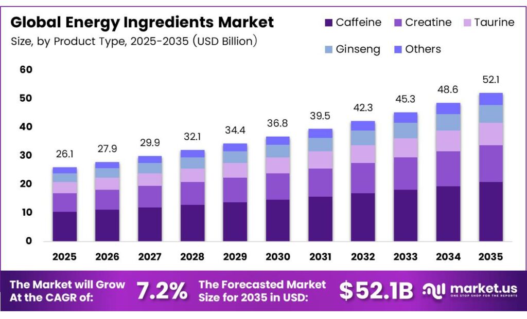 The Global Energy Ingredients Market size is expected to be worth around USD 52.1 billion by 2035 from USD 26.1 billion in 2025, growing at a CAGR of 7.2% during the forecast period 2026 to 2035.
