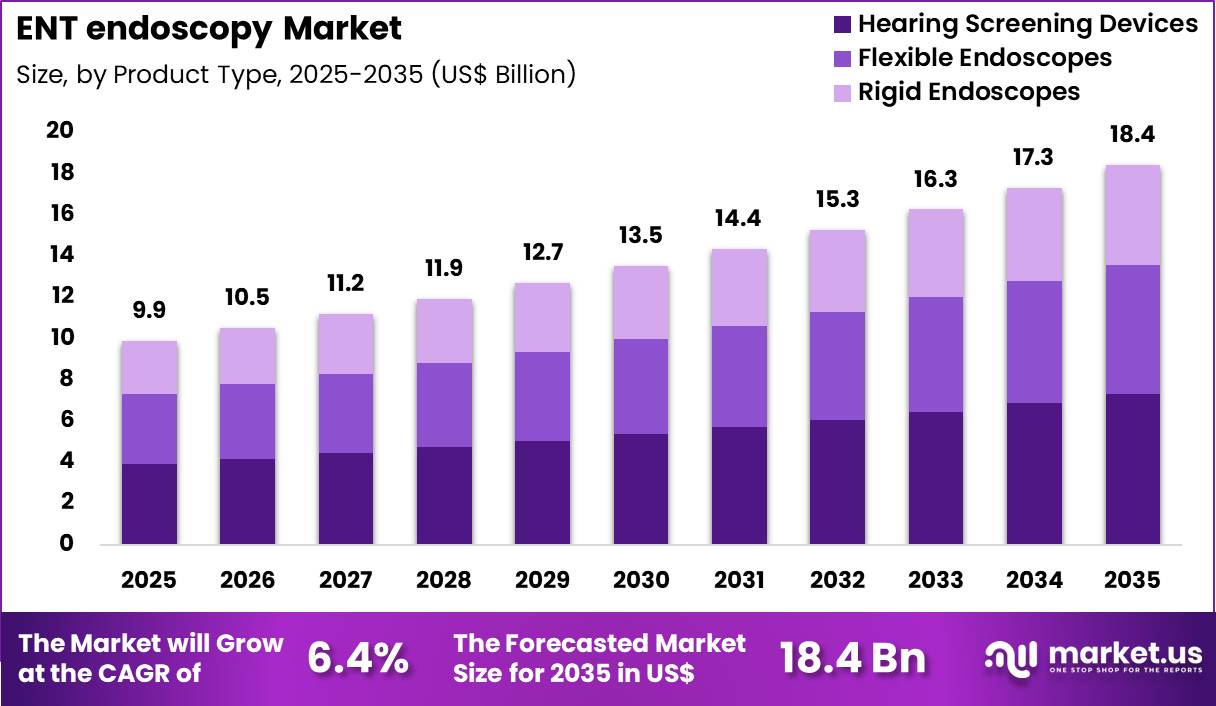 Report Features Description Market Value (2025) US$ 9.9 Billion Forecast Revenue (2035) US$ 18.4 Billion CAGR (2026-2035) 6.4% Base Year for Estimation 2025 Historic Period 2020-2024 Forecast Period 2026-2035 Report Coverage Revenue Forecast, Market Dynamics, COVID-19 Impact, Competitive Landscape, Recent Developments Segments Covered By Product Type (Hearing screening devices, Flexible Endoscopes and Rigid Endoscopes), By Applications (ENT clinics, Ambulatory settings and Hospitals) Regional Analysis North America – US, Canada; Europe – Germany, France, The UK, Spain, Italy, Russia, Netherlands, Rest of Europe; Asia Pacific – China, Japan, South Korea, India, Australia, New Zealand, Singapore, Thailand, Vietnam, Rest of APAC; Latin America – Brazil, Mexico, Rest of Latin America; Middle East & Africa – South Africa, Saudi Arabia, UAE, Rest of MEA Competitive Landscape Olympus Corporation, Karl Storz, Stryker, Richard Wolf, Medtronic, Smith & Nephew, HOYA Corporation, ConMed, Pentax Medical, ATMOS MedizinTechnik Customization Scope Customization for segments, region/country-level will be provided. Moreover, additional customization can be done based on the requirements. Purchase Options We have three licenses to opt for: Single User License, Multi-User License (Up to 5 Users), Corporate Use License (Unlimited User and Printable PDF)
