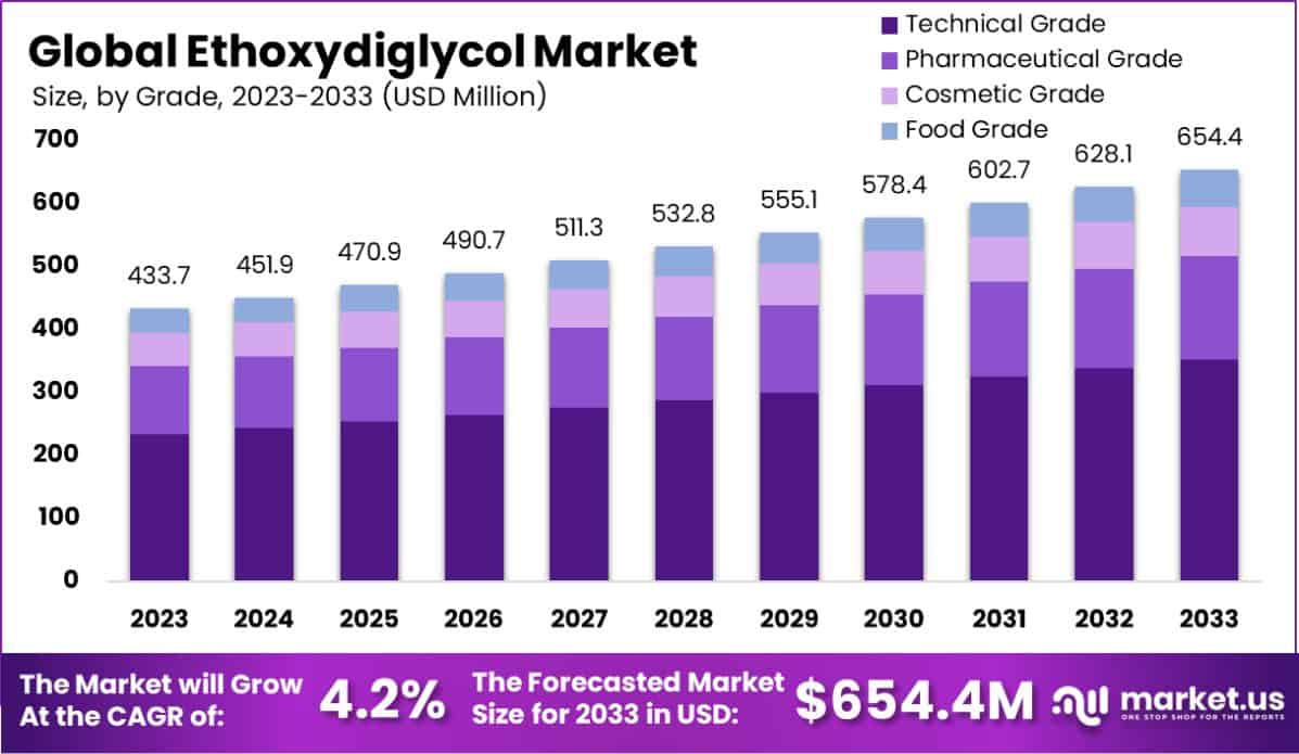- The Global Ethoxydiglycol Market is expected to be worth around USD 654.4 Million by 2033, up from USD 433.7 Million in 2023, and grow at a CAGR of 4.2% from 2024 to 2033.