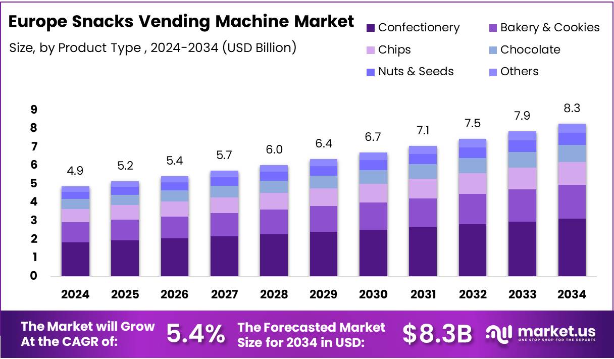 Europe Snacks Vending Machine Market size is expected to be worth around USD 8.3 Billion by 2034, from USD 4.9 Billion in 2024, growing at a CAGR of 5.4% during the forecast period from 2025 to 2034.