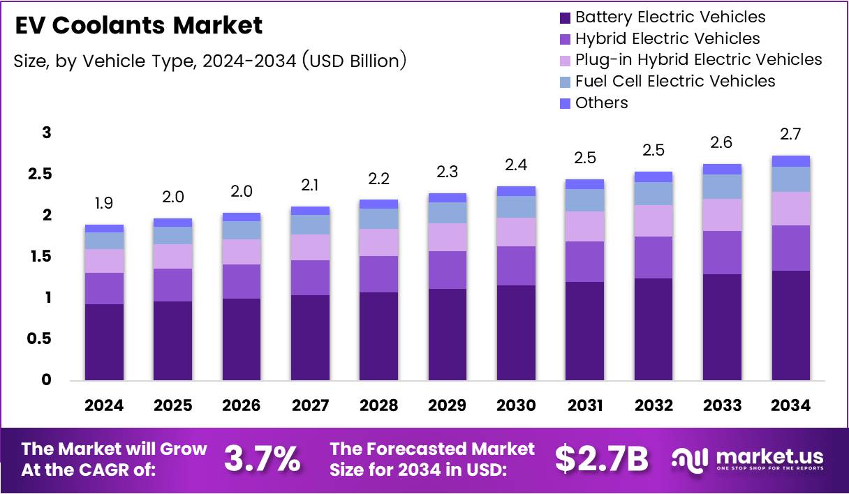 - The Global EV Coolants Market is projected to reach USD 2.7 Billion by 2034, growing at a CAGR of 3.7% from 2025 to 2034.
