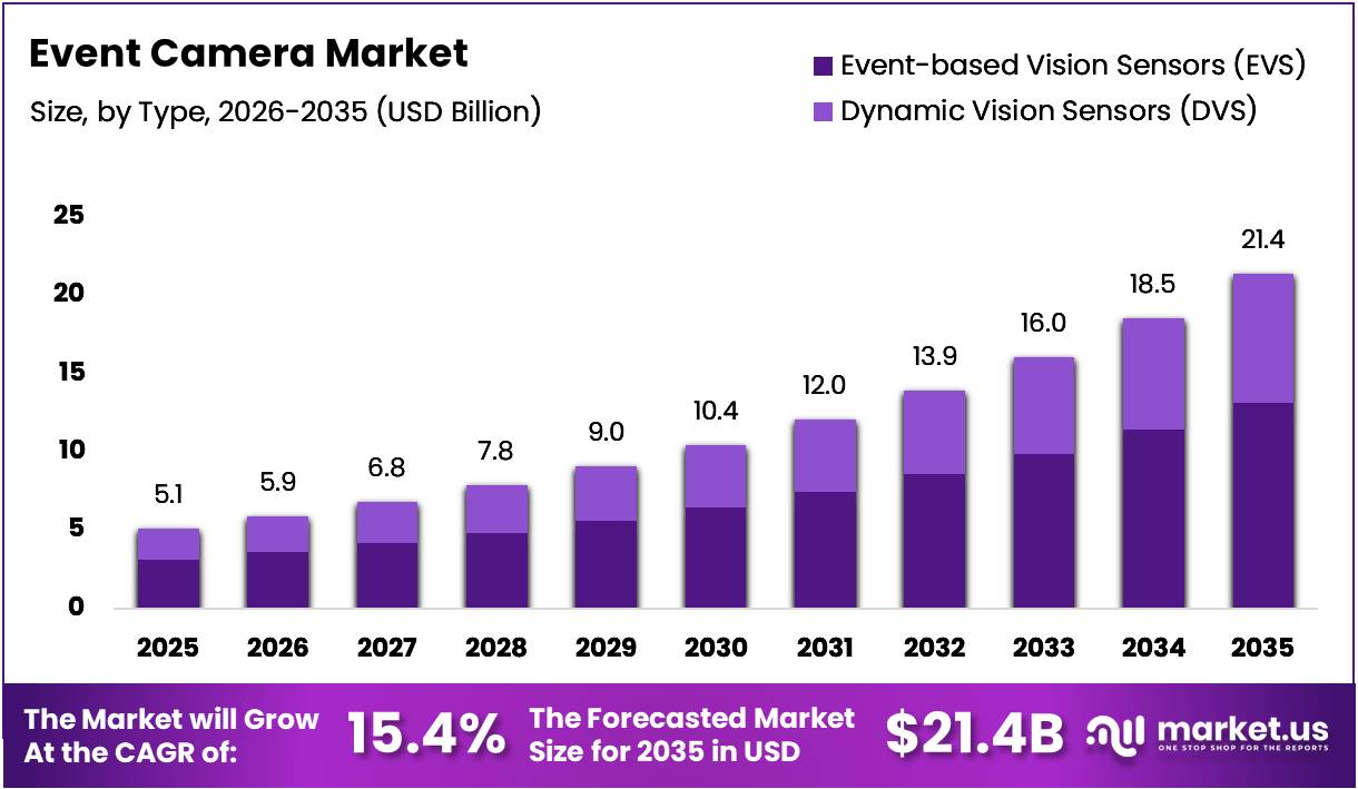 - Global Event Camera Market is projected to reach USD 21.4 Billion by 2035 from USD 5.1 Billion in 2025, at a CAGR of 15.4%