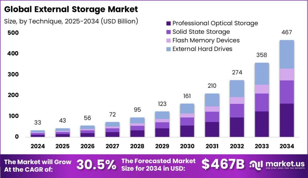 - The Global External Storage Market size is expected to reach USD 467 Billion by 2034, growing from USD 32.6 Billion in 2024. This represents a compound annual growth rate (CAGR) of 30.50% during the forecast period from 2025 to 2034.
