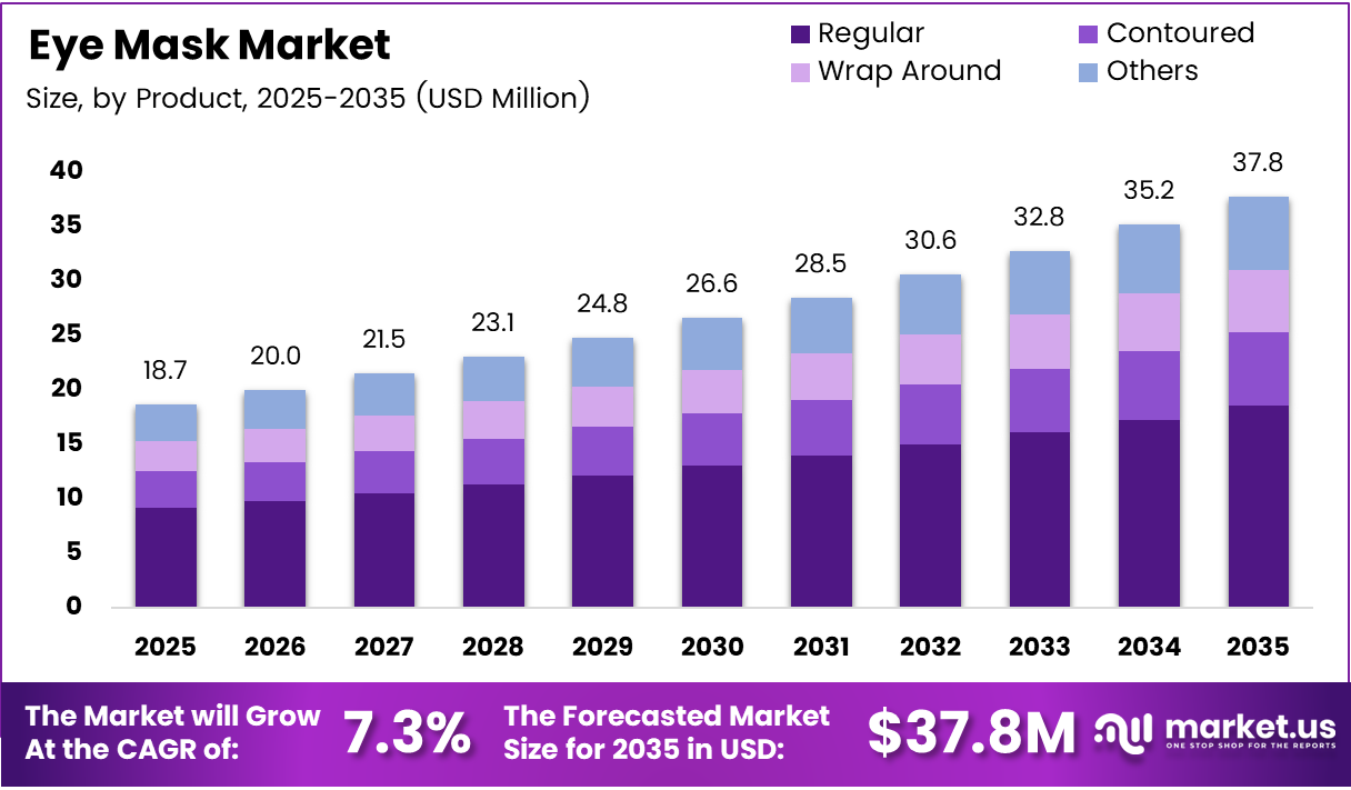 The Global Eye Mask Market size is expected to be worth around USD 37.8 Million by 2035 from USD 18.7 Million in 2025, growing at a CAGR of 7.3% during the forecast period 2026 to 2035.