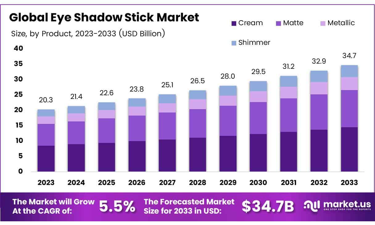 The Global Eye Shadow Stick Market size is expected to be worth around USD 34.7 Billion by 2033, from USD 20.3 Billion in 2023, growing at a CAGR of 5.5% during the forecast period from 2024 to 2033.