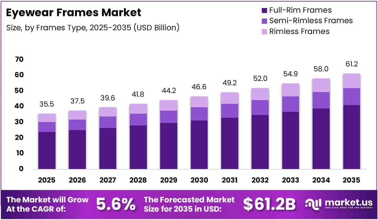 The Global Eyewear Frames Market size is expected to be worth around USD 61.2 Billion by 2035 from USD 35.5 Billion in 2025, growing at a CAGR of 5.6% during the forecast period 2026 to 2035.