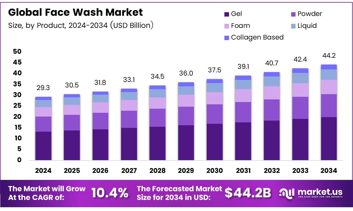 - Global Face Wash Market projected to grow from USD 29.3 billion in 2024 to USD 44.2 billion by 2034, with a CAGR of 4.2%.