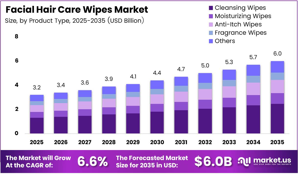Global Facial Hair Care Wipes Market size is expected to be worth around USD 6.0 Billion by 2035 from USD 3.2 Billion in 2025, growing at a CAGR of 6.6% during the forecast period 2026 to 2035.