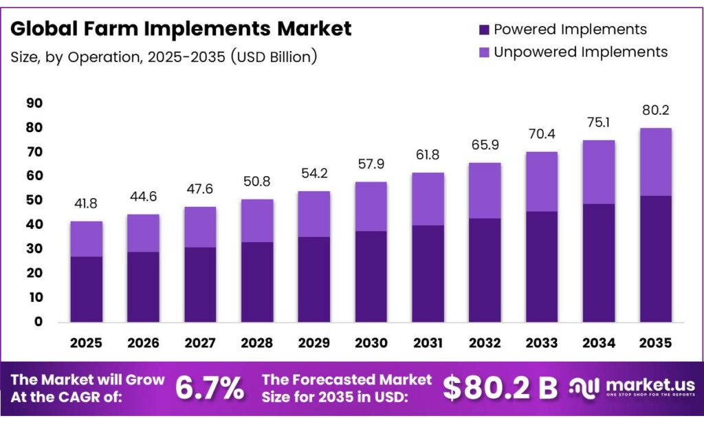 - The Global Farm Implements Market is projected to reach USD 80.2 billion by 2035, from USD 41.8 billion in 2025 at a CAGR of 6.7% during the forecast period 2026–2035.