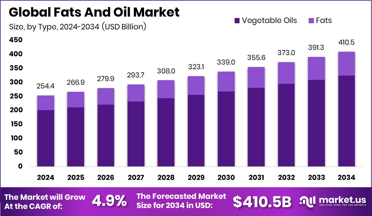 - The Global Fats And Oil Market is expected to be worth around USD 410.5 billion by 2034, up from USD 254.4 billion in 2024, and is projected to grow at a CAGR of 4.9% from 2025 to 2034.