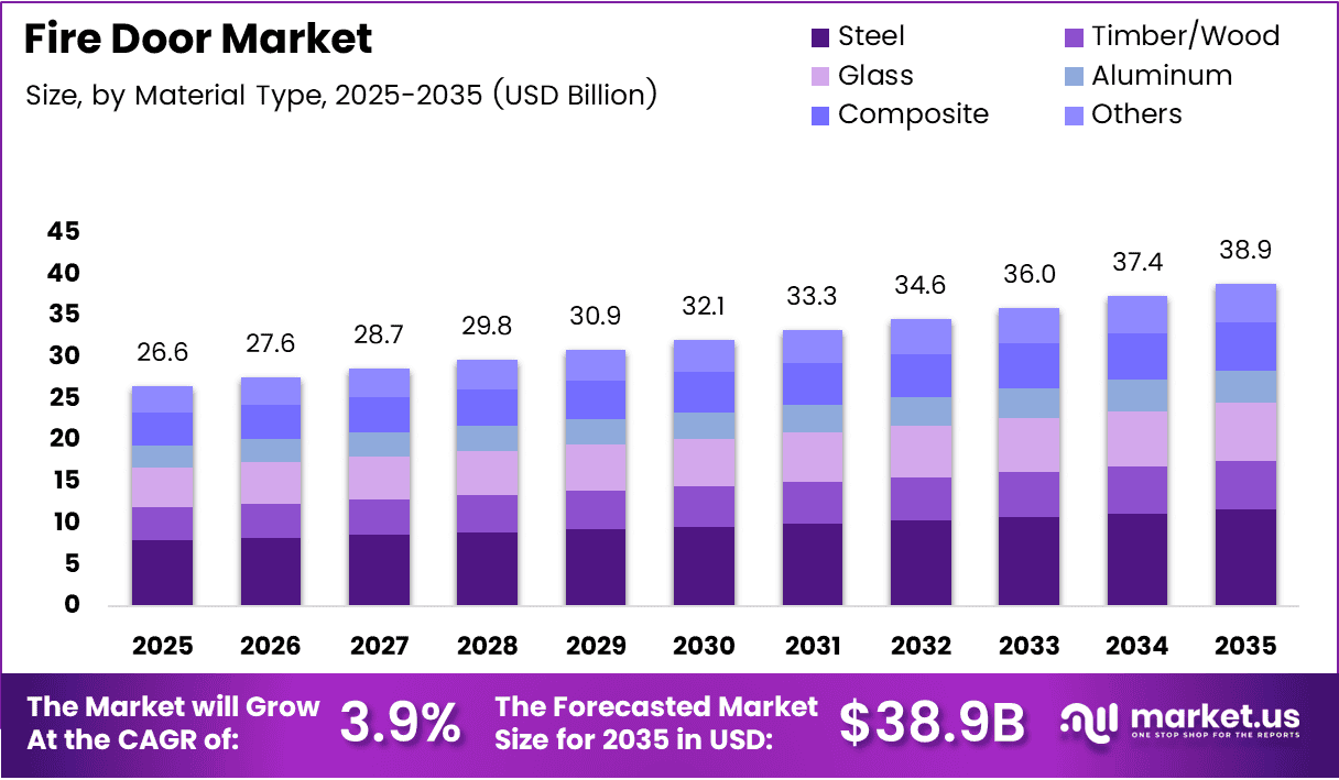 Global Fire Door Market size is expected to be worth around USD 38.9 Billion by 2035 from USD 26.6 Billion in 2025, growing at a CAGR of 3.9% during the forecast period 2026 to 2035.