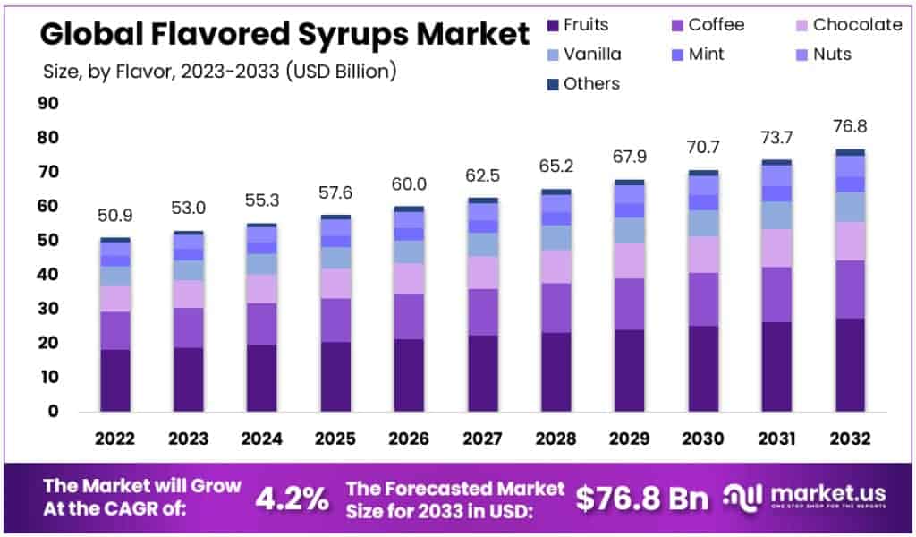 The Global Flavored Syrups Market size is expected to be worth around USD 76.8 Billion by 2033, from USD 50.9 Billion in 2023, growing at a CAGR of 4.2% during the forecast period from 2023 to 2033.