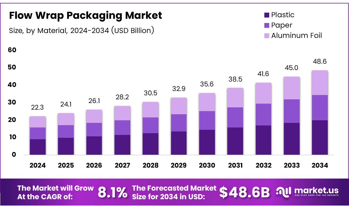 - Global Flow Wrap Packaging Market projected to grow from USD 22.3 Billion in 2024 to USD 48.6 Billion by 2034, at a CAGR of 8.1%.