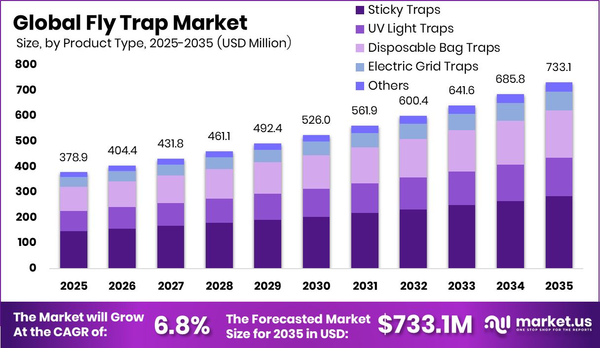 - The Global Fly Trap Market is expected to be worth around USD 733.1 million by 2034, up from USD 378.9 million in 2024, and is projected to grow at a CAGR of 6.8% from 2025 to 2034.