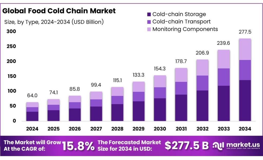 - Food Cold Chain Market size is expected to be worth around USD 277.5 Billion by 2034, from USD 64.0 Billion in 2024, growing at a CAGR of 15.8%.