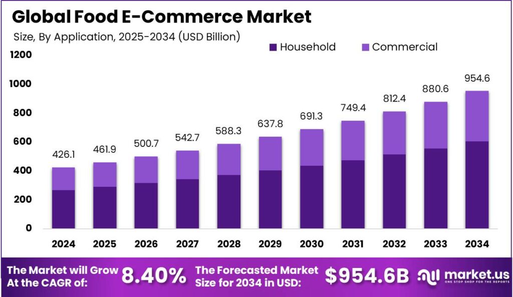 - The Global Food E-Commerce Market size is expected to reach around USD 954.6 Billion by 2034, up from USD 426.1 Billion in 2024, growing at a CAGR of 8.40% during the forecast period from 2025 to 2034.