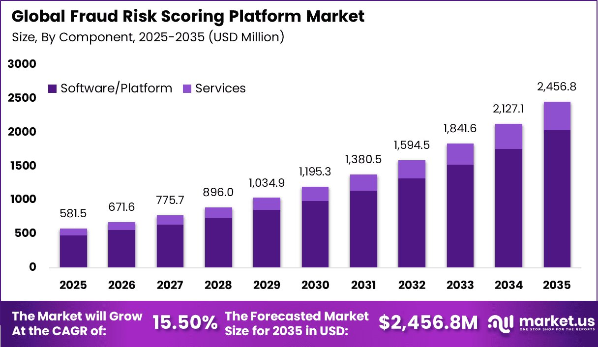 The Global Fraud Risk Scoring Platform Market generated USD 581.5 million in 2025 and is predicted to register growth from USD 671.6 million in 2026 to about USD 2,456.8 million by 2035, recording a CAGR of 15.50% throughout the forecast span. In 2025, North America held a dominan market position, capturing more than a 38.2% share, holding USD 222.13 Million revenue.