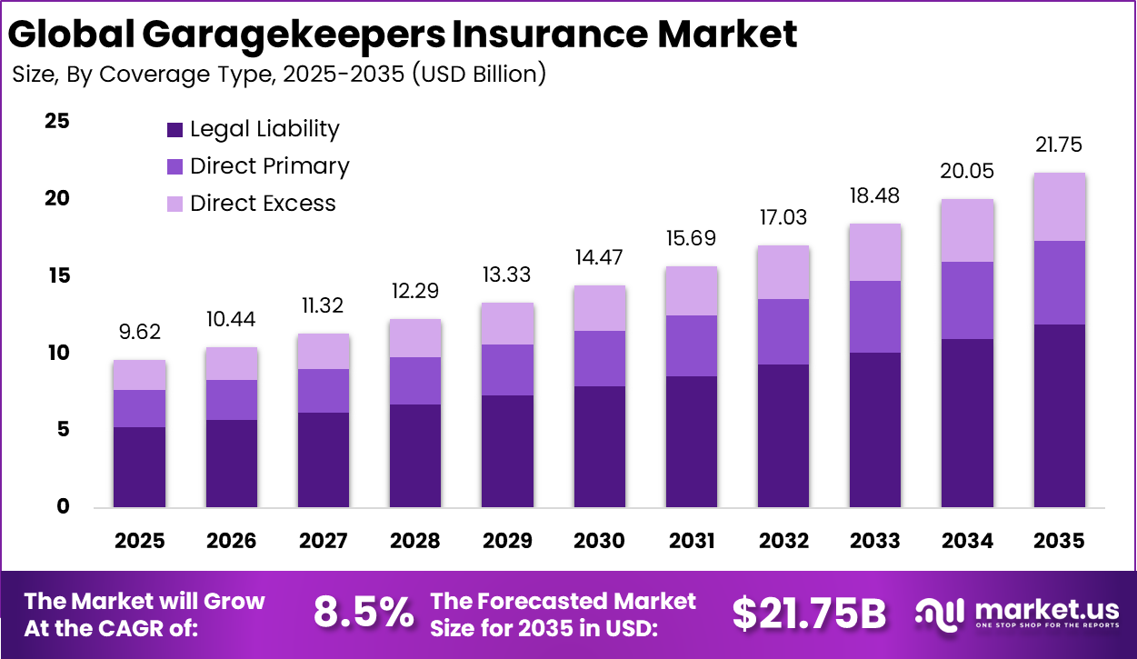 Global Garagekeepers Insurance Market Size, Share and Analysis Report By Coverage Type (Legal Liability, Direct Primary, Direct Excess), By Vehicle Type (Passenger Vehicles, Commercial Vehicles, Specialty Vehicles), By End-User (Automotive Repair Shops, Service Stations, Parking Garages, Car Washes, Dealerships, Others), By Distribution Channel (Direct, Brokers/Agents, Online), By Regional Analysis, Global Trends and Opportunity, Future Outlook By 2025-2035