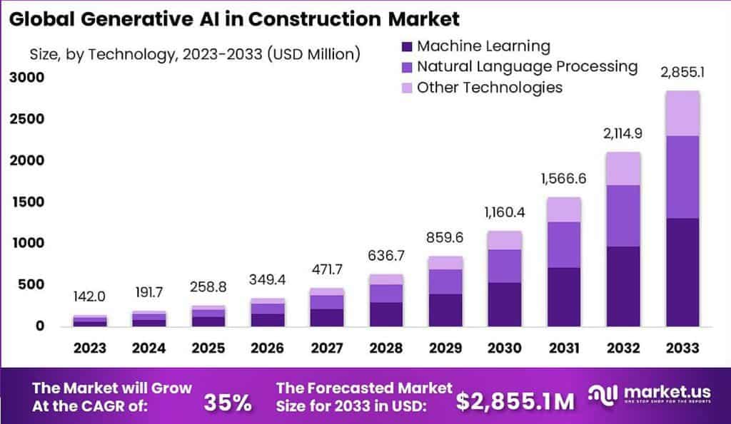 - By the conclusion of 2024, more than 50% of leading construction firms will have integrated Generative AI solutions across multiple facets of their operations, encompassing design, planning, execution, and maintenance.