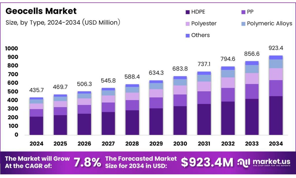 - The Global Geocells Market is projected to reach USD 923.4 million by 2034 from USD 435.7 million in 2024, growing at a CAGR of 7.8% from 2024 to 2034.