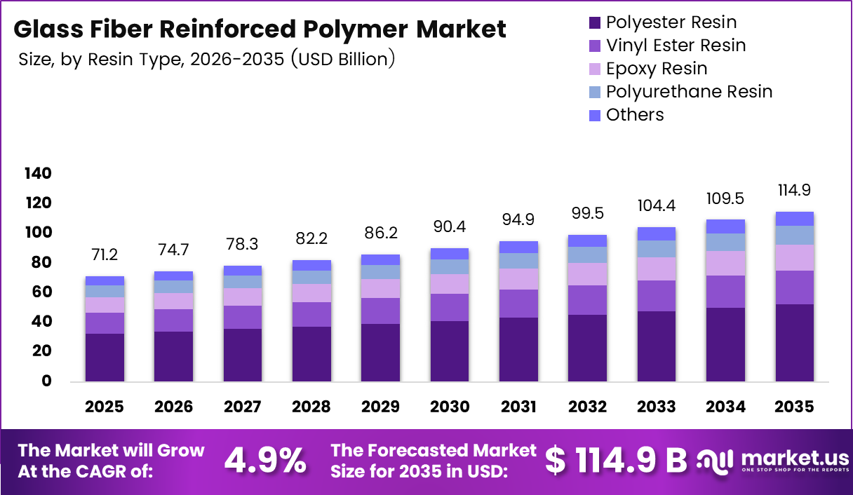 Global Glass Fiber Reinforced Polymer Market size is expected to be worth around USD 114.9 Billion by 2035 from USD 71.2 Billion in 2025, growing at a CAGR of 4.9% during the forecast period 2026 to 2035.