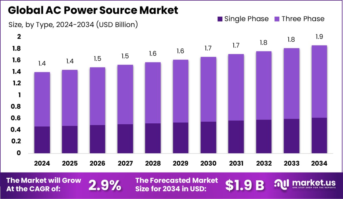 - Global AC Power Source Market is expected to be worth around USD 1.9 billion by 2034, up from USD 1.4 billion in 2024, and grow at a CAGR of 2.9% from 2025 to 2034.