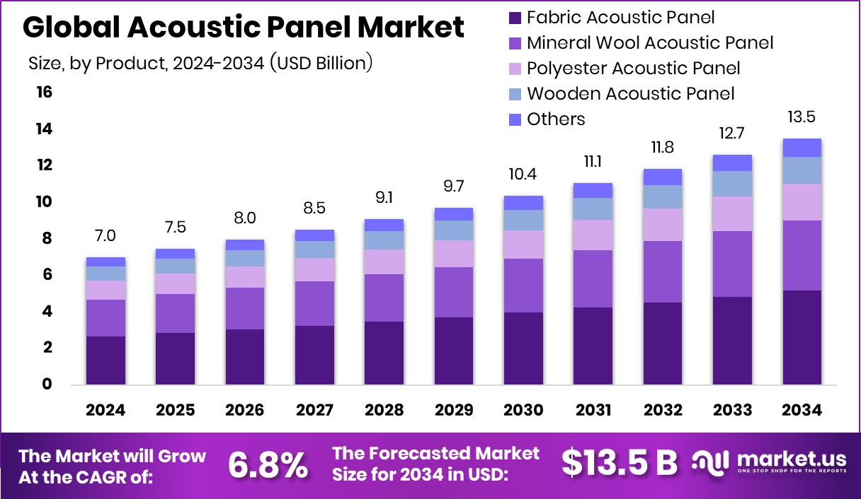 - Global Acoustic Panel Market is expected to be worth around USD 13.5 billion by 2034, up from USD 7.0 billion in 2024, and grow at a CAGR of 6.8% from 2025 to 2034.