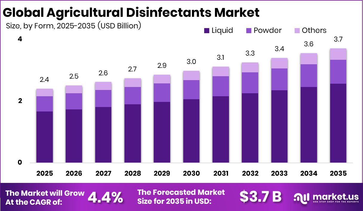 - The Global Agricultural Disinfectants Market is expected to be worth around USD 3.7 billion by 2034, up from USD 2.4 billion in 2024, and is projected to grow at a CAGR of 4.4% from 2025 to 2034.