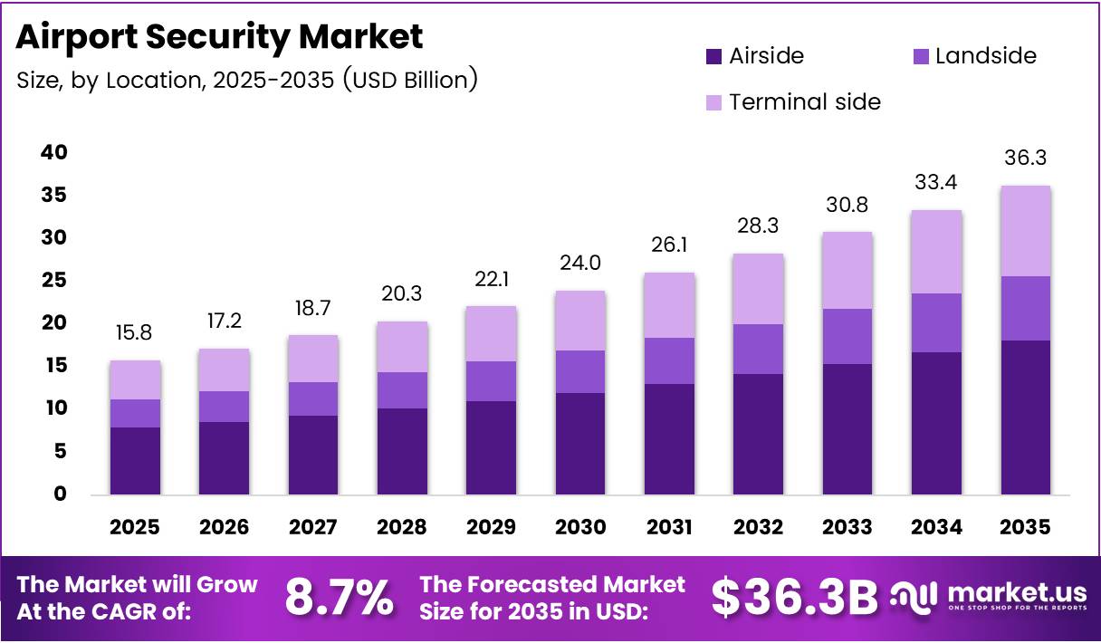 In 2025, Airside held a dominant market position in the By Location segment of the Airport Security Market, with a 47.9% share. Airside zones sit between the final passenger screening checkpoint and the aircraft itself. Any security failure in this zone carries the most severe consequence — direct threat access to aircraft — which forces airport operators to deploy the highest specification systems at higher unit cost than anywhere else in the terminal.