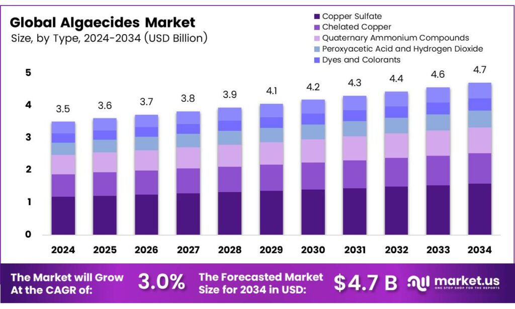 The Global Algaecides Market size is expected to be worth around USD 4.7 billion by 2034, from USD 3.5 billion in 2024, growing at a CAGR of 3.0% during the forecast period from 2025 to 2034.