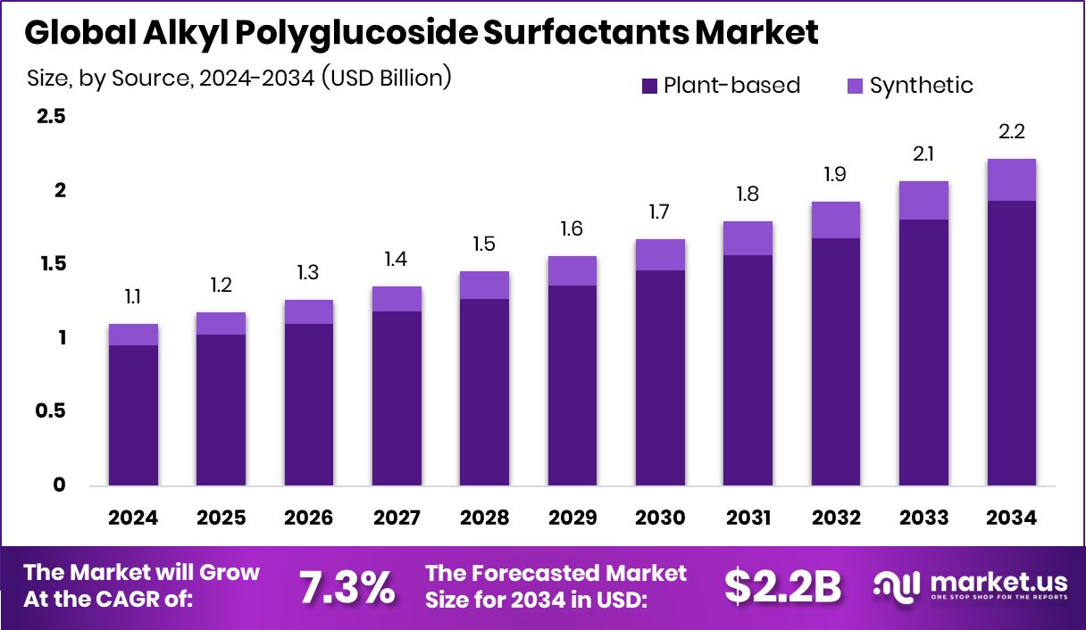 - The Global Alkyl Polyglucoside Surfactants Market is expected to be worth around USD 2.2 billion by 2034, up from USD 1.1 billion in 2024, and is projected to grow at a CAGR of 7.3% from 2025 to 2034.