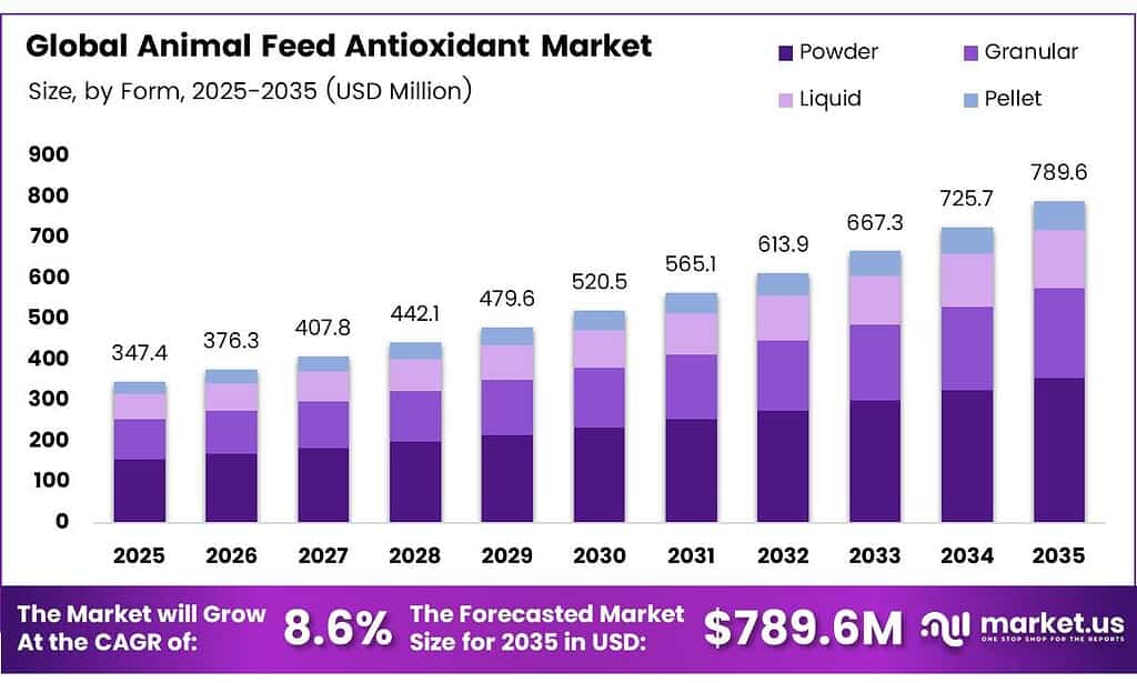 The Global Animal Feed Antioxidant Market size is expected to be worth around USD 789.6 million by 2035 from USD 347.4 million in 2025, growing at a CAGR of 8.6% during the forecast period 2026 to 2035.