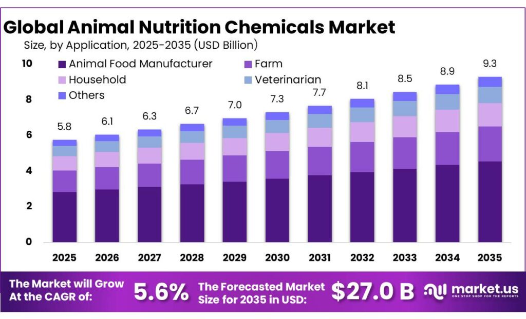 - Animal Nutrition Chemicals Market size is expected to be worth around USD 27.0 Billion by 2035, from USD 15.7 Billion in 2025, growing at a CAGR of 5.6%.