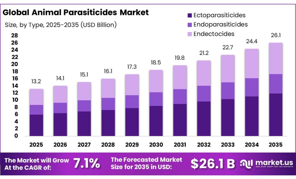 - Animal Parasiticides Market size is expected to be worth around USD 26.1 Billion by 2035, from USD 13.2 Billion in 2025, growing at a CAGR of 7.1%.