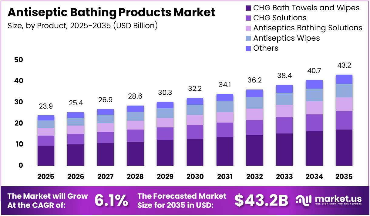The Global Antiseptic Bathing Products Market size is expected to be worth around USD 43.2 Billion by 2035 from USD 23.9 Billion in 2025, growing at a CAGR of 6.1% during the forecast period 2026 to 2035.