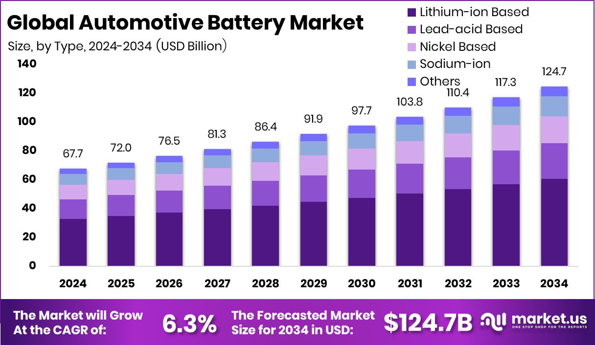- The Global Automotive Battery Market is expected to be worth around USD 124.7 billion by 2034, up from USD 67.7 billion in 2024, and is projected to grow at a CAGR of 6.3% from 2025 to 2034.