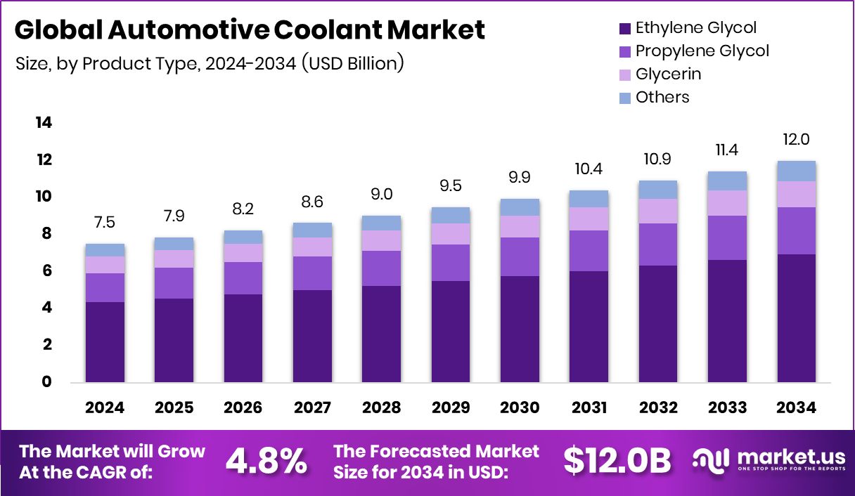 - The Global Automotive Coolant Market is expected to be worth around USD 12.0 billion by 2034, up from USD 7.5 billion in 2024, and is projected to grow at a CAGR of 4.8% from 2025 to 2034.