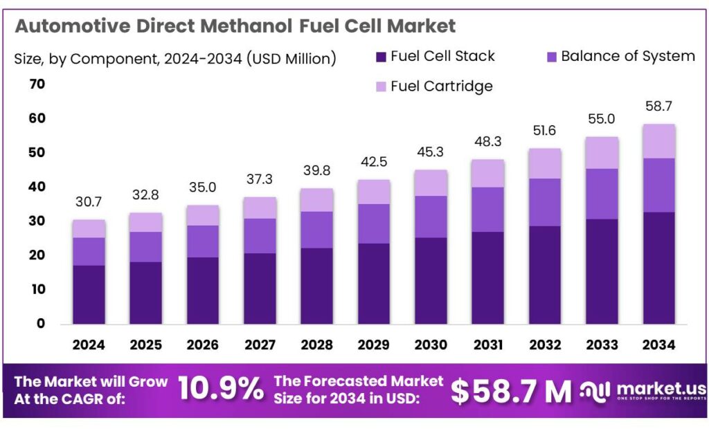 - Automotive Direct Methanol Fuel Cell Market size is expected to be worth around USD 58.7 Million by 2034, from USD 30.7 Million in 2024, growing at a CAGR of 10.9%.
